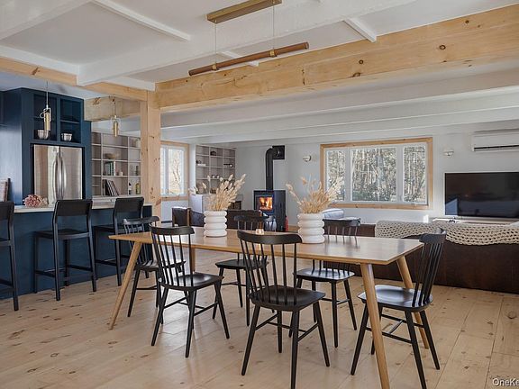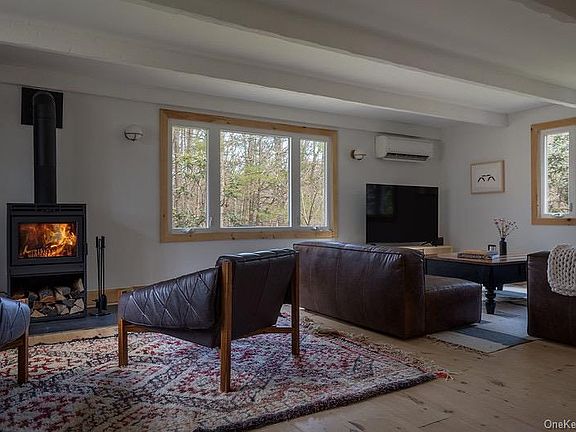 Welcome to 91 Old Queens Highway, a beautifully updated and fully furnished, 3-bedroom, 1.5-bath cabin set on 21 acres of quiet, wooded privacy in the heart of Kerhonkson. This spacious home blends Scandinavian design with rustic warmth, featuring light pine wide-plank floors, exposed beams, concrete countertops and built-in shelving throughout. Cozy up by the wood-burning stove or enjoy year-round comfort with efficient mini-splits for both heating and cooling.