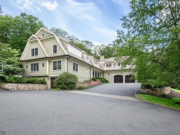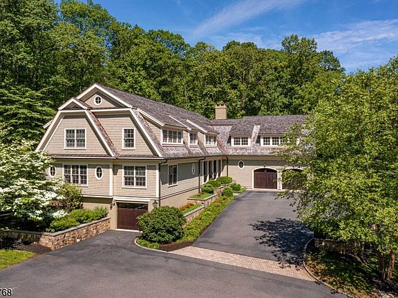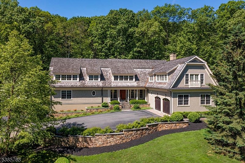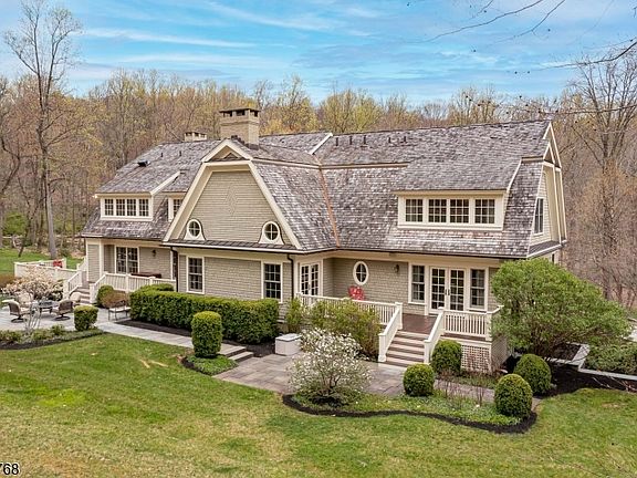 Stunning 2010 Shingle-style home designed by noted architect Nick Cusano with interior decoration by award-winning Katja van der Loo. Sited on a promontory on its almost 7 AC on the Bernardsville Mountain on a cul-de-sac street. Privacy, privacy! Mature trees, flowering shrubbery, stone walls & a stream highlight the property. Step indoors from the bluestone floored front porch to a generous-sized entry foyer with handsome staircases, walk-in guest closet wide oak floor & custom lighting. Rooms are generously sized yet warmly inviting. The beamed great room ceiling is a work of art. Anchoring the room is a raised-hearth fieldstone floor-to-ceiling fireplace.. Circular windows flank the fireplace. Two sets of French doors provide access to the wrap-around ipe deck. French doors from the Entry Foyer open to the living room featuring French doors to the deck & 2 oval windows. The Bar is conveniently located between the living and great rooms and features a temperature-controlled wine room with slate floor. There is a first-floor office. A marble floor highlights the formal powder room. Wainscoting accents the Dining Room. The Designer kitchen features a stone floor, high-end appliances, indoor barbecue & center island. The Den, mudroom & informal powder room complete this level.The luxurious primary suite is flooded with natural light & the white marble bathroom is spa like. A loft, 3 more bedrooms, 2 more baths & laundry complete the 2nd floor. Finished LL.(