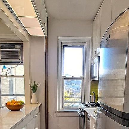 The generous living room is ideal for entertaining and connects seamlessly to an open kitchen featuring stainless steel appliances and dishwasher. The king-size bedroom offers ample space for a reading nook or writing desk—along with more of those captivating park views. Even the windowed bathroom enjoys a direct sightline to The Cloisters.