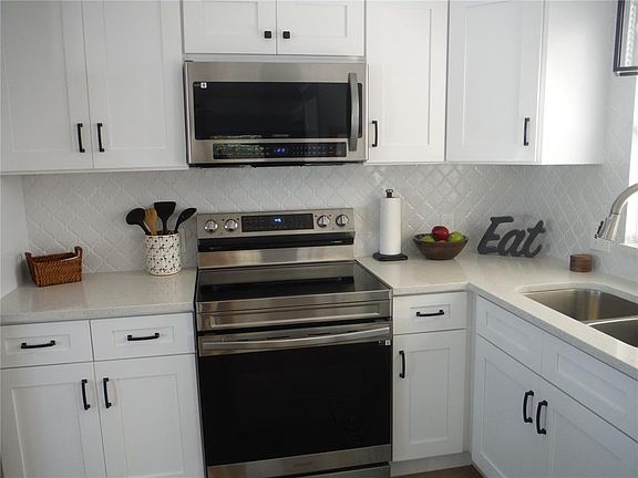 Beautifully renovated 2 bedroom 2 bath with subfloors redone 2024 and luxury vinyl floors. Kitchen is now very modern and has appliances installed in May 2024 - even has a wine fridge, soft close drawers, quartz countertops. Fully furnished - move right in. Mattresses were new in May 2024. Vapor barrier with a transferable warranty was installed Sept 2024. Great room plan is super - really open floorplan. Baths were remodeled. Both have showers and are gorgeous. This is a 55+ community and this home allows you to bring your sweet little furry cat. The deeded lot 50X80 is included in the price and is in a no flood zone. Maintenance fee is $223/Month and includes water, sewer, trash, lawn, private roads, laundryroom (in case your appliances break), clubhouse, heated pool & spa, and shuffleboard. You will be very impressed with this friendly community with little lake, winding roads, & huge trees. Room measurements approximate.