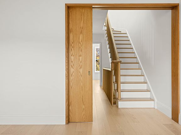 A power room is cleverly tucked behind the kitchen, hidden by a pocket door at the top of the stairs to the garden level entrance and cellar stairs.