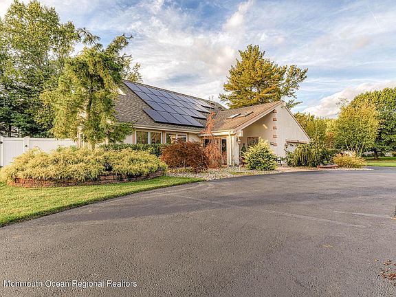 Unique home & property in desirable West Freehold offers a host of updates for its new owners! Great curb appeal w/impressive circular drive, prof. landscaping, huge covered/skylit front patio/porch, custom front door - entry open to sunken LR w/new wood floors, DR w/sliding door to side patio, counter seating to the updated kitchen w/granite, tile backsplash, SS appliances, pot-filler, wine fridge and window seat/storage. Family room, powder room and a bedroom/office round out the main floor. Upstairs has large master suite w/WIC and custom skylit bath, two additional bedrooms and custom bath w/shower seat & skylight. Fenced backyard paradise w/gunite pool, shed, stamped concrete patio. Peace of mind w/furnace, AC & HWH new 2019. Hurry and make this one yours!