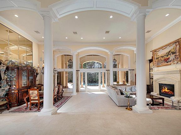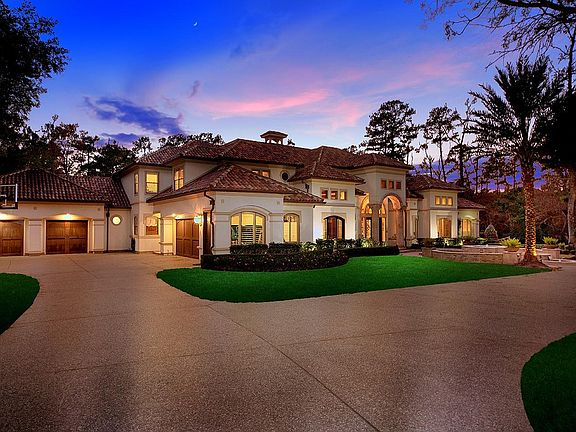 Exceptional Jeff Paul custom home on 1.32 acres that backs to the George Mitchell Nature Reserve in Heritage Hill! New roof in 2018, whole house generator, fully fenced and gated with circular driveway and beautiful fountain! Chef's island kitchen with granite counters, Thermador double ovens and cooktop overlooks the sunny breakfast room and den with walls of windows overlooking the private backyard; wine room; formal dining opens to formal living area; owner's retreat with cozy fireplace, spa-like bathroom, huge his & hers closets and bonus room for exercise or nursery; 2 additional bedrooms down make this home live like a one story! Handsome study with French doors and built-ins; 2 bedrooms, media room and game room with huge balcony up; four car garage; private backyard oasis with no rear neighbors features outdoor kitchen, infinity edge pool and spa with fire bowls and fountains, fire pit and sports court all surrounded by professional landscaping enhanced with lighting.