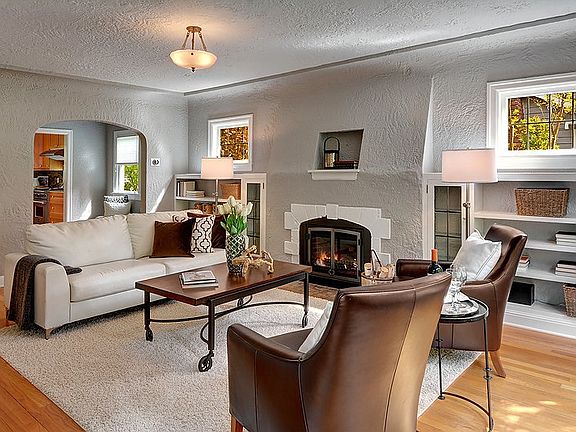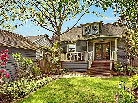 Sweet, arched entry welcomes you to this updated Tudor w/ gleaming hardwoods & pretty LR with gas frpl. Beautiful kitchen w/ Wolf range, Miele D/W, tile flooring opens to formal dining room. Double doors out to deck and lushly landscaped yards, garden area and patios. Bright bath and bedroom on main. Master w/ walk in closet and peek a boo Mt Rainier view, small 2nd room, and large, remodeled bath with heated floors all on top floor. Media room, bedroom, wine cellar, potential MIL all in lower.