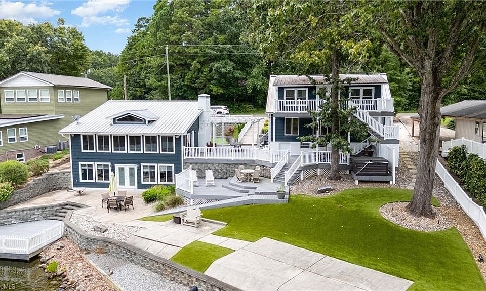 Amazing 100 ft of waterfront with multi-level areas, plenty of space for entertaining. Fenced yard offers vinyl railings and trex decking on all levels including the boat dock. Covered boat slip w/ cable lift (5500 lbs capacity) and 2 jetski floaters. FULLY FURNISHED home offers lots of natural light flowing through the wall of windows to enjoy the lake views from the open floor plan on the main level as well as the walkout basement. Home offers 4 bedrooms (2 bedrooms in basement without windows). Both levels offer a full bath, basement laundry in utility room. Large family room w/ mini kitchen in walkout basement. Enjoy the wood burning fireplaces to warm on cool evenings or relax in the hot tub. Detached 2 car garage (built in 1980) & driveway offers ample parking. Garage has storage areas inside and out, half bath & additional bonus room living space above garage with large deck to enjoy views of the spacious patios & waterfront. Sunrise mornings & mirrored sunset evenings await.