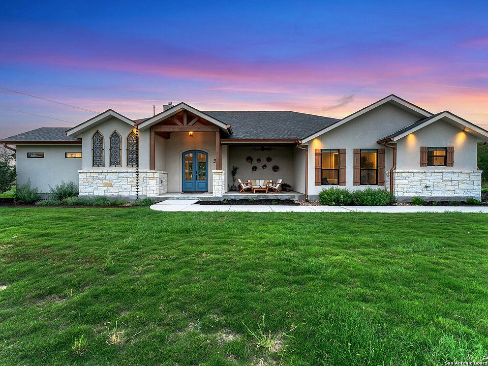 A once-in-a-lifetime opportunity to own a luxurious gated home in the desirable Oxbow on the Guadalupe community. This almost brand-new property (SRT) offers private access to the Guadalupe Riverfront and community pool and features an open-concept living space perfect for entertaining. The serene outdoor area is enhanced by a 700+ covered patio, and music lovers will appreciate the nearby Whitewater Amphitheater. Located minutes from Canyon Lake and a short drive to Gruene and downtown New Braunfels, this exquisite home embodies seamless indoor-outdoor living, elegant finishes, and breathtaking hillside views on 1.2 acres of land. Experience tranquility and sophistication in every detail of this exceptional home in the highly desired Oxbow on the Guadalupe, prepare to be amazed by this move-in-ready residence! Don't forget to see the dog bath in the utility room, the extra sitting on from porch patio, the gorgeous vaulted ceilings, and plenty of cabinet space. SRT's are allowed.