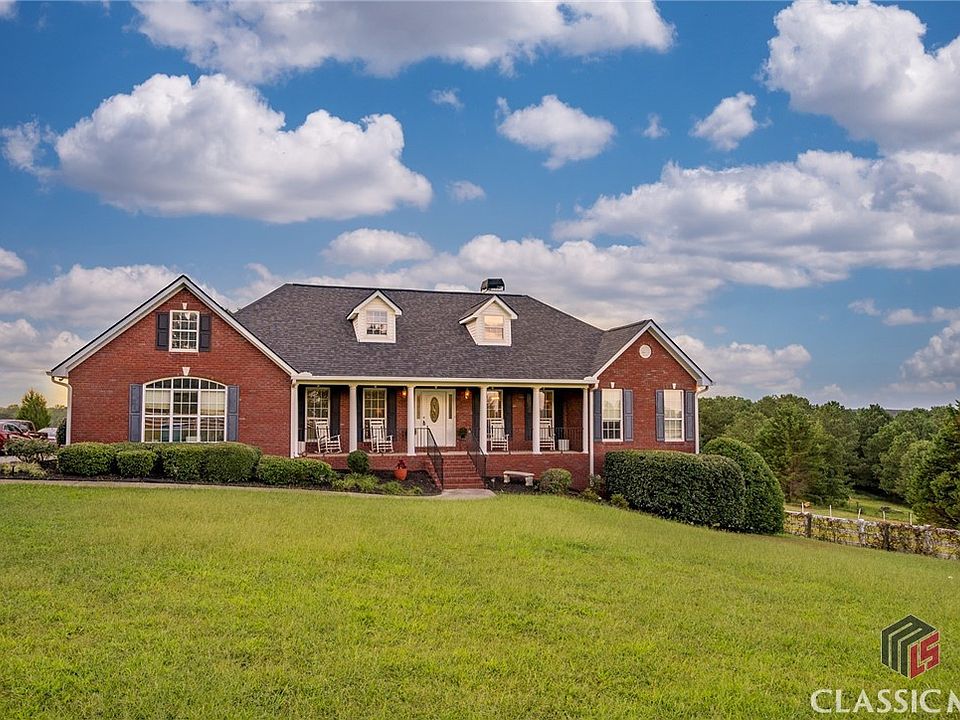 This remodeled farmhouse will not be one to miss. Refinished hardwood floors, fully remodeled kitchen with stainless appliances and quartz counters. Separate living room, dining room, and family room. Family room features floor to ceiling windows and sky lights for plenty of light. Owners suite is oversized and can hold the largest furniture. An entire wall of windows coupled with vaulted ceilings, and sky lights, give the room a light and airy feel. The owners bath features a separate tiled shower and a soaking tub. The finished basement offers endless possibilities. A theater, office, exercise room, craft room, or playroom.... are just a few possibilities. Additional bedroom and bath downstairs offers more room for larger families or guest. The fenced and cross fenced pastures are ready for your animal friends. There is a 2 stall barn and a 4 stall barn with feed/tack room and plenty of room for storage. Big screened-in porch and a deck out back lends plenty of room to entertain family and friends. All this sitting atop a knoll with cinematic views and a nice breeze that seems to always blow. This farm really has it all and is minutes to downtown Monroe, 25 minutes to Athens, and easy access to I20 and Hwy 316.