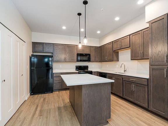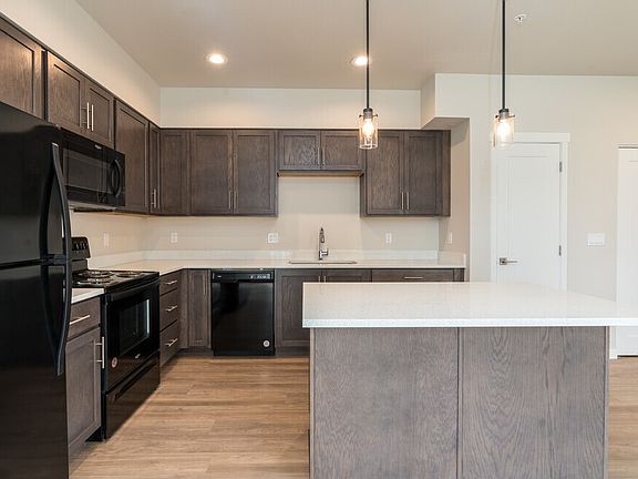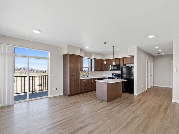 Private patio or deckSleek black appliancesWhite quartz kitchen islandsLight lvp flooringHuge slidersSoft bedroom carpetCustom cabinets