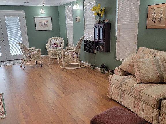 This is a lovely furnished 2 bedroom 2 bath home with beautiful Arizona room with wall Ac and fans. There is a craft room in the Arizona room with closets. This home offers a wonderful garage and a separate shed as well. The home offers a beautiful open floorplan with a heating unit to make for a cozy family room on those chilly winder days. The kitchen has a breakfast bar and a dining area as well. There is a carport area as well as a driveway where the garage is. Plenty of parking! New exterior paint this year. Ac has been replaced some years ago, Roof has been replaced 11 years ago. There is an additional refrig out in the shed. This is a wonderful home on a oversized lot- only 1 HOA fee with a garage! Very desired!!
