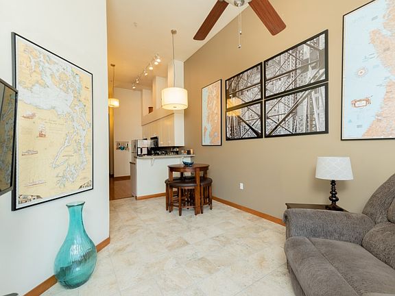 Top floor end unit in this expansive 2 bed, 1 bath, condo! Take the elevator up from the secured parking garage. Upscale condo features a private entry, 13' vaulted ceilings, hardwood & tile floors, stainless steel appliances, washer/dryer & plenty of storage. Large windows bring in extra light. One bedroom has the added bonus of a loft for additional space. Enjoy the rest of the complex with landscaped airy central courtyard & freshly painted building. Easy access to I-5, bus line, trails, shopping & restaurants.