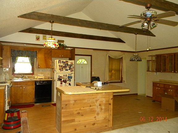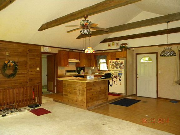 This is an awesome retreat. Wooded, with beautiful pond fully stocked. Bridge goes to an island in the middle. This is a single wide that has had additions. Never could you know it was a mobile home. Survey of left line has some discrepancies. Garage and well are split by property line. See survey. Reduced for quick sale! Owner says SELL!!! House has had a water leak and floors in Master BR are rolling. Some mold. Timber is over 40 years old.