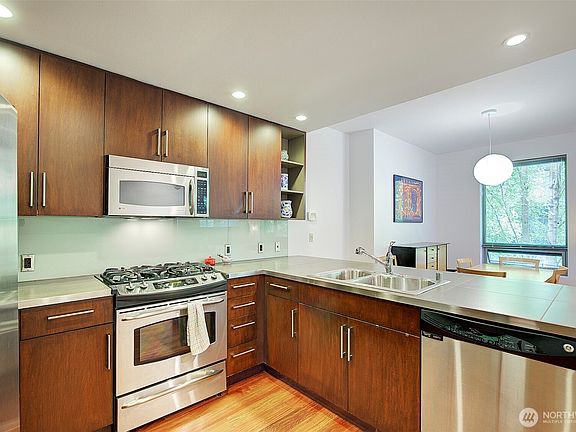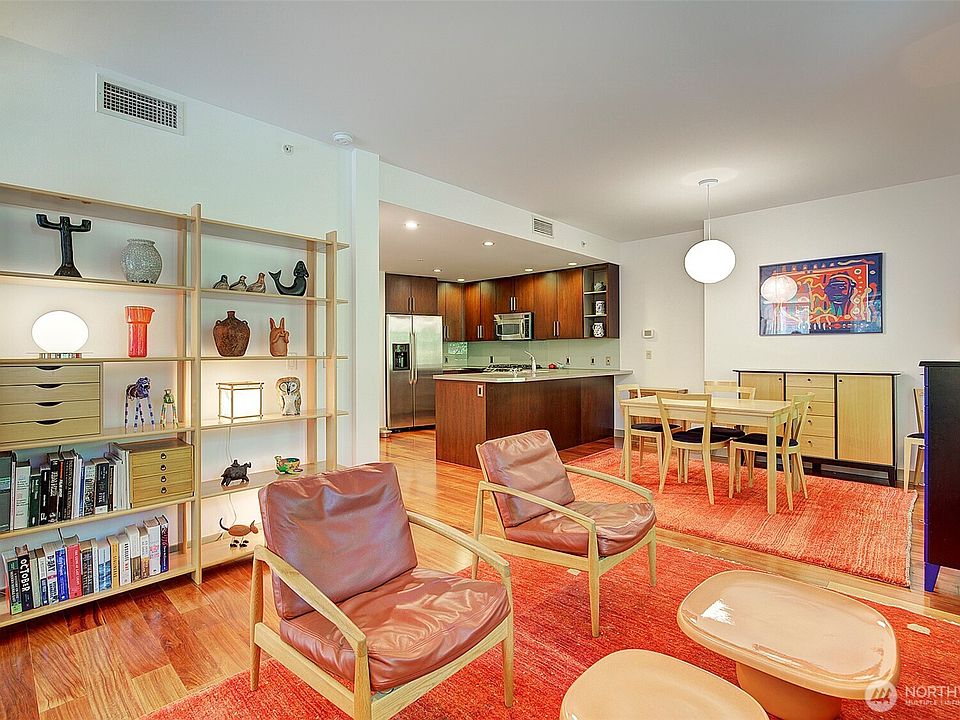 Beautiful 1bd/1ba, plus den/office condo in the heart of SLU! Rare southwest facing, corner unit with an open concept design and natural light-filled living areas framed by large picture windows among the treetops. Elegant Brazilian Cherry floors, SS appliances, two-sided gas fireplace, and private balcony off den create a warm and inviting spaces. Spacious main bedroom with sliders and balcony. Storage & laundry in unit. Enjoy 5-star amenities including concierge, security, fitness center, spa, sauna, game room, 12-seat theater, guest suite, and rooftop garden lounge. Includes 1 garage parking and storage. Perfect 100 Walk Score—Steps to 2200 Westlake retail plaza with Whole Foods & shops, and to Amazon, Facebook & Google.