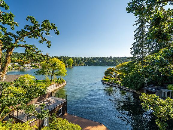 One of Lake Oswego's finest waterfront properties. Ideally situated on a private half acre parcel with stunning southern main lake views and all day sun exposure. Mostly single level living with the master and three main floor en-suites all facing the lake. Perfect for indoor/outdoor entertaining with spacious open floor plan, expansive hardscape, pool, spa, covered living, rooftop boat-house patio, private dock, theater and ample parking. Walk or boat to all of downtown Lake Oswego amenities.