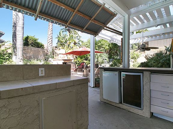 outside balcony deck for lounging. This Large Private Corner Lot also features a blockwall perimeter, Lush landscaping with various Palms, Koi pond, Backyard fireplace with sit down hearth and patio for entertaining. Entertaining back yard patio bar area features BBQ, refrigerator, wine