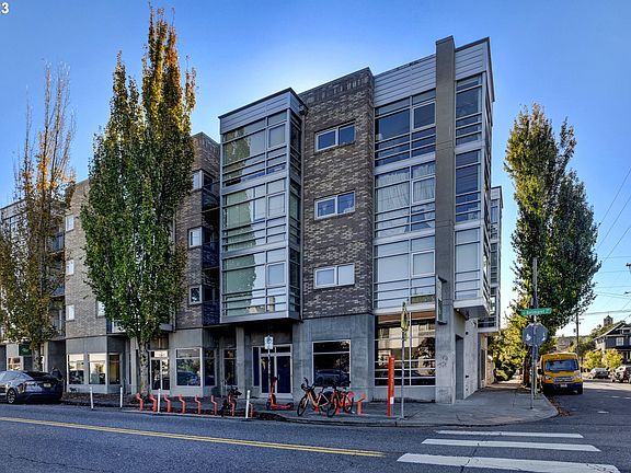 Absolutely stunning contemporary space! Amazing layout that lives larger than its sqft - great flex space to fit your lifestyle & taste! Corner unit with floor-to-ceiling windows, 2 covered balconies create an airy, light & spacious feel. Primary Suite w/double closets, gas FP, reading alcove & attached bath. Large hall bath + 2nd bedroom - perfect for guest, office or hobby room. Open "Cook's Kitchen" w/gas range, BI micro, SS appliances & delightful breakfast nook. Generous dining room boasts handspome built-shelves. Gorgeous hardwoods throughout. 14' X 10' locked storage on lower level. Elavator access to all floors including gated parking - 2 parking spots included in sale. Stellar Hawthorne-Belmont-Mt Tabor-ish location! A real gem!