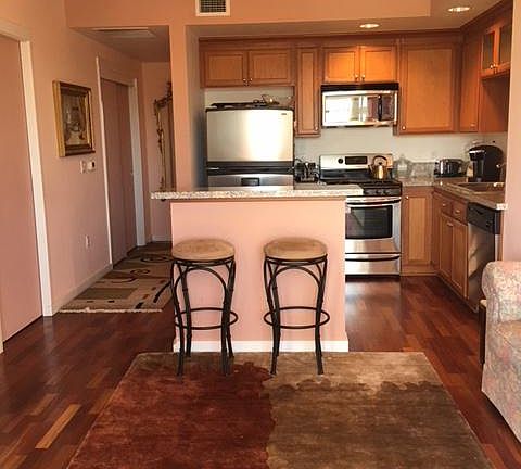 Email owner to schedule a viewing. This is a quiet property in a modern building. NOT a studio! Lovely third floor one bedroom, one bath, air conditioning, new washer and dryer in unit, fireplace, deck, floor to ceiling windows with territorial view, stainless steel appliances, granite countertops, hardwood floors throughout, prime parking spot in gated parking lot, elevator in building, secure separate bike community storage room plus very large private storage unit. Close to all amenities & bus line. If interested, fill out an application on Zillow, or fill out an application in person at a viewing. Renter pays first months rent, last months rent and damage deposit upon signing lease. All other terms listed on rental agreement. Renter pays utilities.