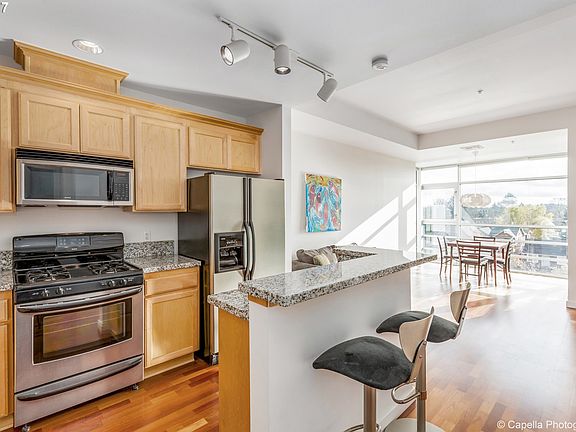 Beautiful top floor 1 Level Condo at Andria in Belmont Mt Tabor district. Open floor plan, stunning floor to ceiling S. facing windows showcase city, see thru gas FP, kitchen w island granite, SS appl. WD, AC. Sec monitored entry, gated covered pkg, 9x6 secured storage, bike storage. Steps to Belmont food carts, restaurants, pubs, parks & shopping. On busline! Very quiet! Buyer to do own due-diligence on rental cap.
