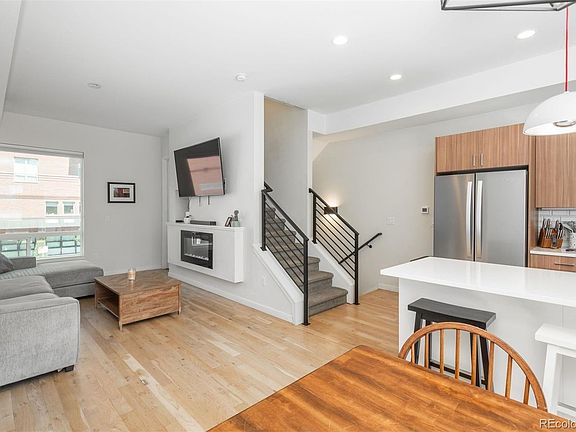 Experience modernist living at its finest in this freshly painted townhome located in the thriving transit-oriented development of Railhouse in Sunnyside. Boasting a premium location with unbeatable rooftop views of downtown Denver and the majestic mountains, this 4-story unit offers luxury living at its best. Upon entering, you'll be greeted by a spacious foyer with a convenient closet and access to an attached 2-car garage - a rare luxury in the city. The second floor showcases an open-concept layout featuring a sleek kitchen with quartz countertops, stainless steel appliances, and soft close cabinetry. The kitchen seamlessly flows into the dining and living areas, all adorned with hardwood flooring and oversized windows that flood the space with natural light. A cozy electric fireplace adds warmth, while a tucked-away powder room is perfect for guests. The bedroom level houses two primary suites, each with their own quartz and tiled baths and ample closet space. A stackable laundry unit is conveniently located next to the bedrooms. On the upper level, step out through an atrium door onto the rooftop deck to enjoy breathtaking views of the city skyline and mountains - perfect for entertaining guests or unwinding with a glass of wine. Located just a block away from the 41st and Fox Street light rail station, this home offers easy access to D.I.A. and is situated near the Platte River and Cherry Creek paths, ideal for outdoor enthusiasts. Within walking distance you'll find a variety of yoga studios and restaurants, including popular spots like Waldschanke Ciders & Coffee, Huckleberry Roasters Coffee, and Diebolt Brewing Company. Experience urban living at its best in this prime Sunnyside location, with the community sharing the cost of snow removal and exterior maintenance for added convenience. Don't miss out on this exceptional opportunity to own a piece of urban paradise!