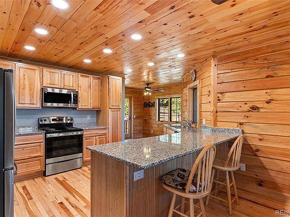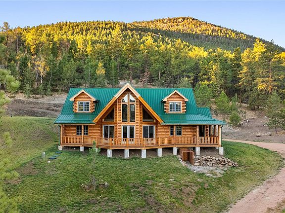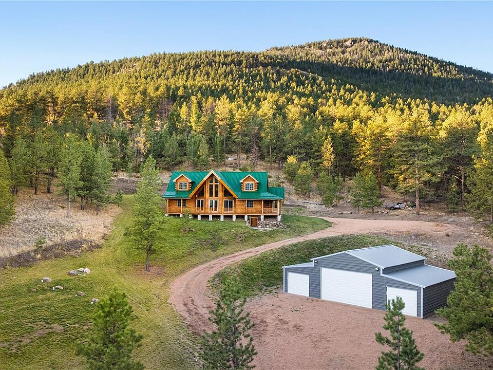 The handcrafted home showcases classic Colorado log cabin architecture with a striking green metal roof and full-length covered porches on both the front and back—ideal for relaxing and soaking in the natural beauty. Inside, an open-concept main level welcomes you with soaring vaulted ceilings, tongue-and-groove wood finishes, and expansive windows that flood the great room with natural light.