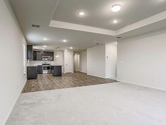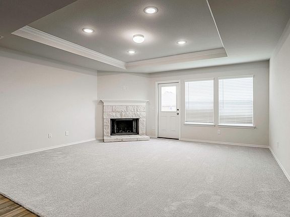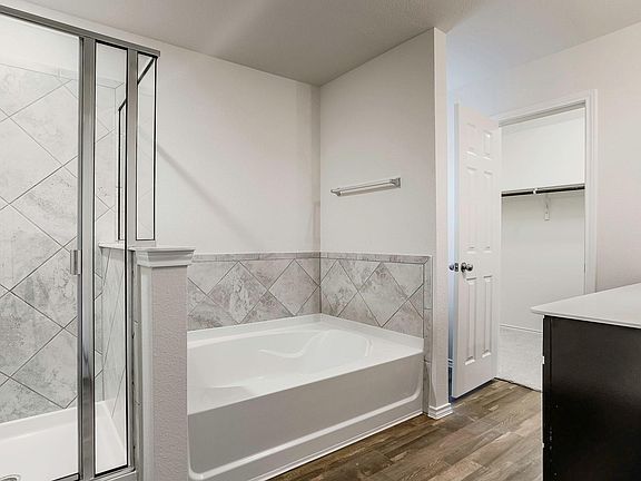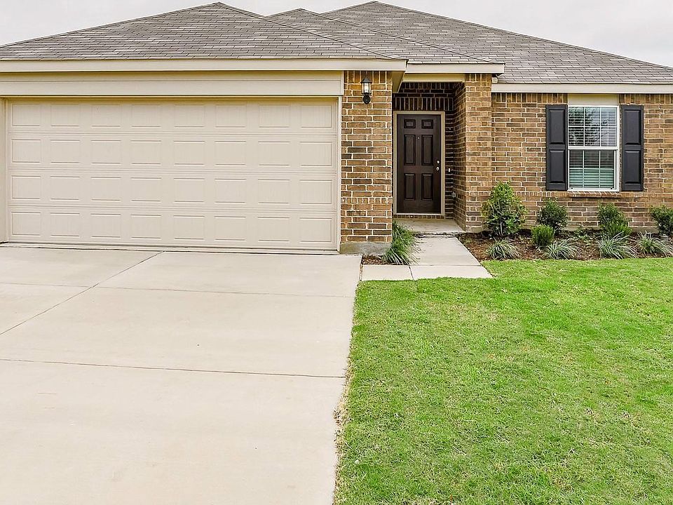 New floor and paint. Lakepointe in Fort Worth. One story Eastgate plan with brick exterior - Elevation N. Flex can be used as bedroom or office etc. Corner homesite + Espresso Cabinetry + Stainless Steel Appliances + tray ceiling in family room + stone fireplace. Separate tub and shower in owner's bath. Community Pool