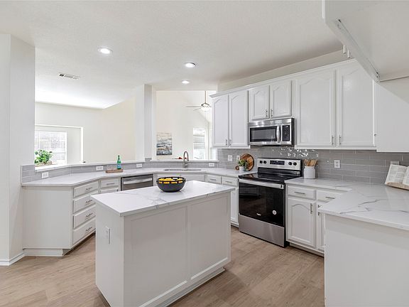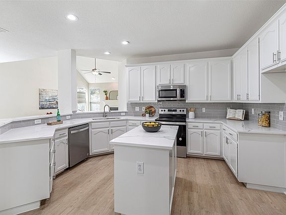 Step inside to find gorgeous wood-look LVP flooring, high vaulted ceilings, and an open-concept design that’s bright, welcoming, and made for modern living. At the heart of the home, the kitchen shines with crisp white cabinets, quartz countertops, subway tile backsplash, stainless steel appliances, and a center island with storage — perfect for cooking, gathering, or casual mornings in the sunny breakfast nook.