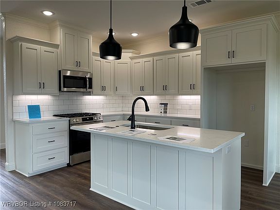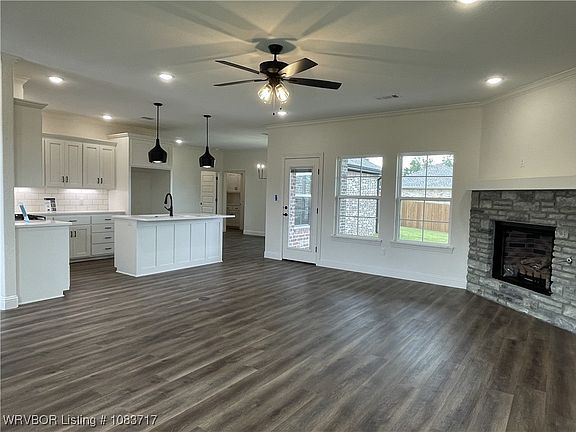 Large living room with corner fireplace separated from kitchen by island bar. 8 ft. entry door and 9 ft. ceilings throughout. Quartz counter tops, under counter lighting, stainless appliances, gas range. Spacious dining area. Mudroom w/lockers. LVP and ceramic tile flooring, no carpet. Walk in tile shower and freestanding soaker tub in master bath. Large secondary bedrooms. Nice, covered patio and covered front porch. Sodded yard, gutters. 2 car garage is rear, side entry, insulated including the door and has a keyless entry pad. High efficiency heat, tankless water heater. Stained privacy fence. Corner lot. House faces south.