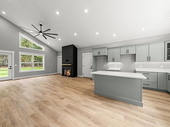 The open concept layout highlights a gas fireplace, quartz countertops, soft close shaker cabinets, LVP flooring, and a walk-in pantry. The primary suite offers a walk-in closet, double vanity, and linen closet. Glass shower doors in the primary bath will be installed prior to closing.