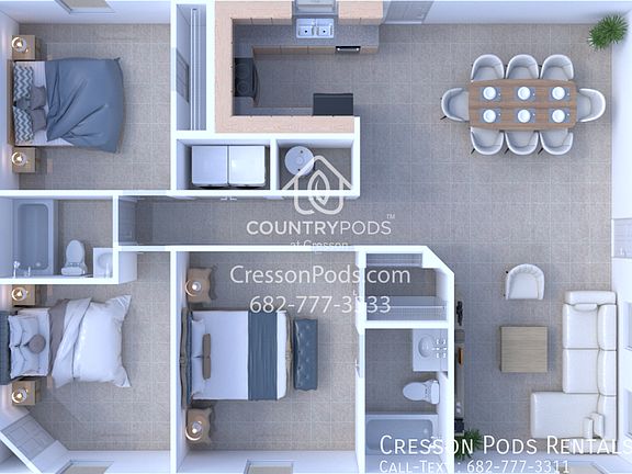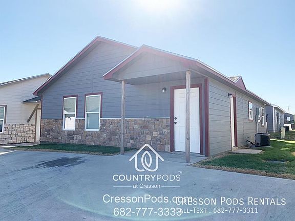 * Move In Special * * ONE MONTH RENT FREE * * Requires Security Deposit Replacement Insurance * What is Cresson Pods? - Single Family Home Rental Community - Professionally managed with On-Site Property Management, Maintenance and Groundskeeping. - Single Family Homes - 3 Bedrooms / 2 Baths - 1200 SF approx - Newer Built less than 3 years old - Pet Friendly - Open Yard Concept - NO Fenced Yard We are in Cresson TX 76035. 15-20 mins to Fort Worth, Weatherford, Granbury, Cleburne, Godley etc. Cresson Pods Rentals * Move In Special * * ONE MONTH RENT FREE * * Requires Security Deposit Replacement Insurance * PROPERTY OVERVIEW ~ Spacious open floor plan ~ Country-style living with grassy open space ~ Energy efficient & low maintenance home ~ Abundant natural daylight, ample windows & patio door ~ Close to cities, work, schools, shops & EVERYTHING you need!! ~ Quiet & secluded residential community ~ Ample open parking spaces ~ Professional on-site Property Management ~ Fort Worth, Granbury, Benbrook, Weatherford, Aledo, Cleburne, Godley, Burleson, Cresson WHY CRESSON PODS ? ~ Exceptional Value - Single Family Home with apartment price ~ Added Privacy - Detached Single Family Home with NO SHARED WALLS ~ Care Free & Maintenance Free Life Style - Professionally maintained by On-Site Management ~ NO Yard Maintenance- Professionally maintained by On-Site Management ~ Fiber Optic 100M+ High Speed Internet READY - Stream anything you want. Are you GAMED? PREMIUM LOCATION ~ Granbury School District ~ Minutes to major freeways I-20, I-820, TX 377 & TX 171 ~ Minutes to Fort Worth, Granbury, Benbrook, Weatherford, Aledo, Cleburne, Godley, Burleson ~ Minutes to EVERYTHING you need!! ~ Lake Granbury & Benbrook Lake recreation areas ~ City of Cresson is a wonderful place to call HOME! NEAR BY CITIES ~ Fort Worth - 20 Miles ~ Granbury - 10 Miles ~ Benbrook - 13 Miles ~ White Settlement - 17 Miles ~ Cleburne - 18 Miles ~ Godley - 7 Miles ~ Burleson - 20 Miles ~ Weatherford - 20 Miles ~ Joshua - 15 Miles ~ Aledo - 13 Miles ~ Willow Park - 20 Miles ~ Crowley - 16 Miles