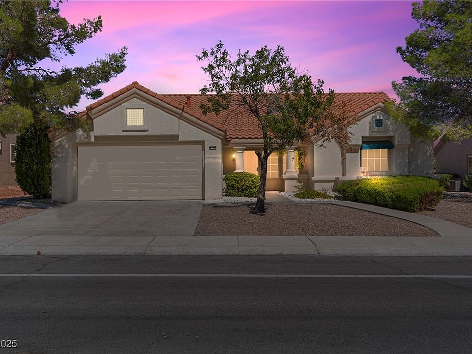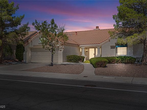 9104 Sundial Dr is a 2 bedroom 2 bathroom single family home located in the Sun City Anthen community. The home is a 1,653 square foot home on a 6,970 square foot lot. The Kitchens and bathrooms have been outfitted with brand new granite countertops. Brand new vinyl flooring throughout the house. New fixtures, chandeliers, and blinds as well. The backyard opens up to a spacious patio that overlooks the 10th green on Palm Valley Golf Course. A must see view. House is located in a quiet 50 and older community. The floor plan is open with a large living room and dining area. Both bedrooms are large and spacious. Primary bedroom has its own large attached bathroom. There is a small isolated room, with built in shelving, that makes for a great office space or study. The house has an attached 2 car garage, and is just a stone's throw away from popular Summerlin shopping and dining areas. Come take a look.