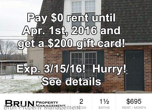 $0 rent until 4/1/16 & $200 gift card! Exp 3/15/16! Hurry! See details These are our March 2016 move in incentives (they expire 3/15/16): No FICO score at all: you get a $200 gift card. 500 to 599 FICO: you get a $300 gift card. 600 to 649 FICO: pay $0 rent until 4/1/16. 650 to 699 FICO: pay $0 rent until 4/1/16 + $200 gift card. 700 to 749 FICO: pay $0 rent until 4/1/16 + $200 gift card + 1/2 off 1st month of renewal. 750 to 900 FICO: pay $0 rent until 4/1/16 + $200 gift card + 1st month of renewal free. Please calls us or visit our website for all qualifications, terms and conditions. www.brunpm.com. (RLNE1835824)