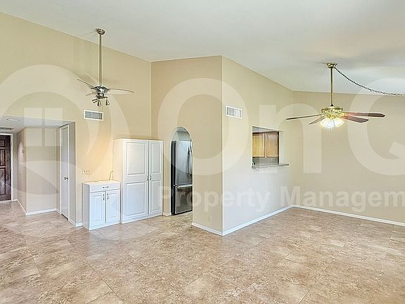 1,033 SQ FT! 2 bedroom, 2 bath home with a comfortable single-story layout. The kitchen features a convenient breakfast bar, ample cabinetry, and comes fully equipped with appliances including a refrigerator, oven, microwave, dishwasher, and garbage disposal. The living room is bright and open, showcasing vaulted ceilings, ceiling fans, and plenty of natural light. The primary bedroom offers a spacious walk-in closet and a private ensuite bath. The secondary bedroom and full guest bath are located nearby, providing functionality and comfort. The laundry room includes a washer, dryer, and additional storage space. A two-car garage offers convenient parking. The backyard features a grass lawn ideal for outdoor relaxation. Located in a well-maintained community with an active HOA, this home provides easy access to nearby parks, dining, and shopping options.
