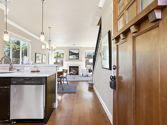 Step inside this perfectly appointed modern St. Johns townhome flooded with ample natural light, beautiful wood floors and a cozy gas fireplace. The true cook's kitchen boasts an eat-in bar, stainless appliances (Fisher Paykel fridge, gas range) and lovely quartz countertops. The open floorplan, abundant windows and high ceilings give the main floor a roomy & airy vibe. Take your morning coffee on the private backyard patio or enjoy evening nibbles & sips a few blocks away in downtown St. Johns. The primary suite is your own personal getaway complete with vaulted ceilings, double closets, and full bathroom. Ease of living with the laundry room upstairs (washer/dryer included) and the attached garage just at the bottom of the stairs. All of this in a fantastic location - with restaurants, cafes and shops just a few blocks away in quaint & funky heart of it all St. Johns. Proximity to Pier Park, Cathedral Park, and the St. Johns Community Center equates to 'a biker's paradise and very walkable' badges of honor from walkscore.com. This well-appointed & well cared for townhouse is 100% turnkey and offers great bang for the buck! No annoying HOA. Home energy score = 7. Welcome home! [Home Energy Score = 7. HES Report at https://rpt.greenbuildingregistry.com/hes/OR10237681]