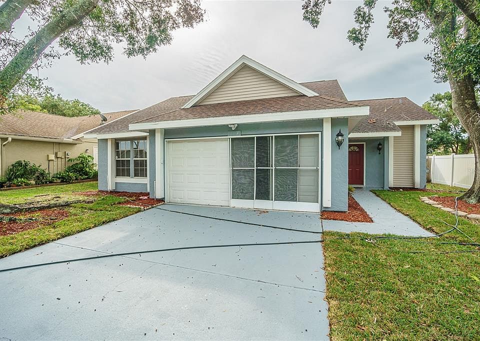 Make this home yours and enjoy the open floor plan with natural light flowing throughout. The primary bedroom has an en-suite bathroom, with a large walk-in shower, wide vanity space, and a walk-in closet with many shelves. The 2nd bedroom also has a large walk-in closet and direct access into the 2nd bathroom. The living room is spacious and opens to the screened lanai, and the private, fully fenced yard. The yearly HOA fee is low compared to most communities in the area. One of the garages has been converted into an office or workshop space, but can easily be converted back to a 2nd car garage.