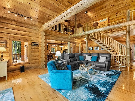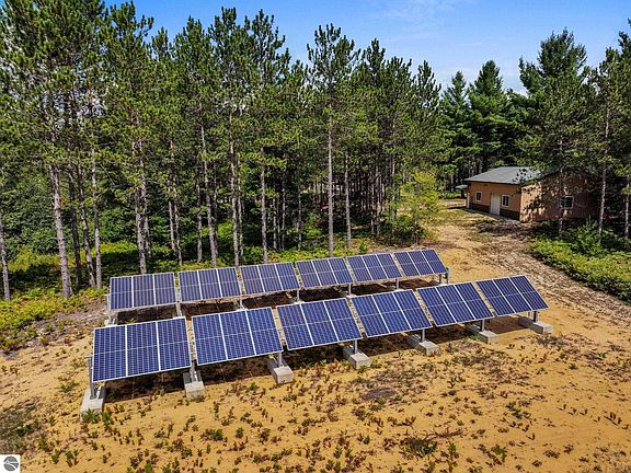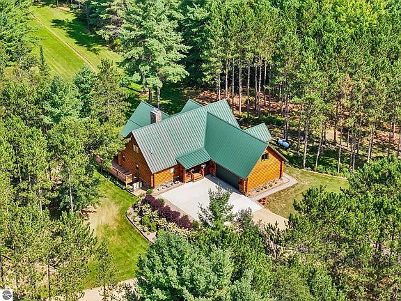 Discover an exceptional full-log estate offering more than 4,000 sq. ft. of beautifully finished living space, set on a secluded 40-acre parcel. Built in 2014 with outstanding craftsmanship, this 4-bedroom, 4-bathroom home combines rustic elegance with modern efficiency. Inside, the main and second floors feature rich wood flooring, knotty-pine walls, full-log beams, and an impressive vaulted ceiling. The home includes two spacious living rooms, a second-floor sitting area, and a fully finished bonus room above the attached two-car garage, providing flexible space for work, guests, recreation, or storage. The kitchen offers warm, natural finishes and granite countertops, blending style and function. Step outside to a massive multi-section deck with three access points, overlooking a manicured five-acre yard that transitions into pristine woodland. A private trail system winds through the property, complemented by three strategically placed deer blinds for wildlife viewing or hunting. Towering red pines and select hardwoods enhance the setting and privacy. A detached pole barn provides ideal space for equipment and recreational storage. Just outside sits a 20-panel solar array delivering exceptional energy efficiency. The home is equipped with geothermal heating and a propane backup system for year-round comfort and reliability. The exterior is impeccably maintained, highlighted by a durable metal roof and premium log construction. This secluded, high-end log home offers luxury, comfort, and sustainability in one extraordinary Northern Michigan setting. A rare opportunity for those seeking privacy, quality, and a truly one-of-a-kind property.