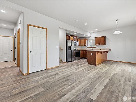 Are you searching for a home that is near Frontier Village, local schools, shopping, dining and in a great location for commuting? If so, then please take a long look at this Eastgate Highland condo just off 91st Ave SE. This main living area is located on the ground floor with new flooring and updated appliances in kitchen, a eating area and a half bath. Upstairs features a secondary living area, laundry (washer & dryer included), primary bedroom with an suite and 2 additional bedrooms and additional bath. Enjoy the parking in a private garage or use the additional space for storage. This home is great for anyone looking to start owning or investors due to its low maintenance living.