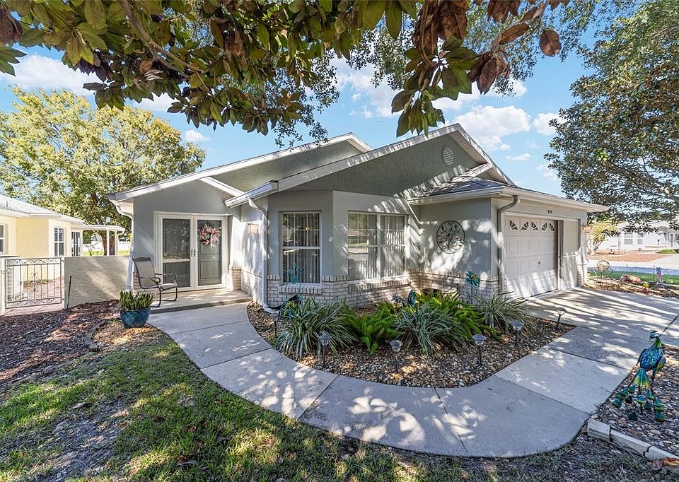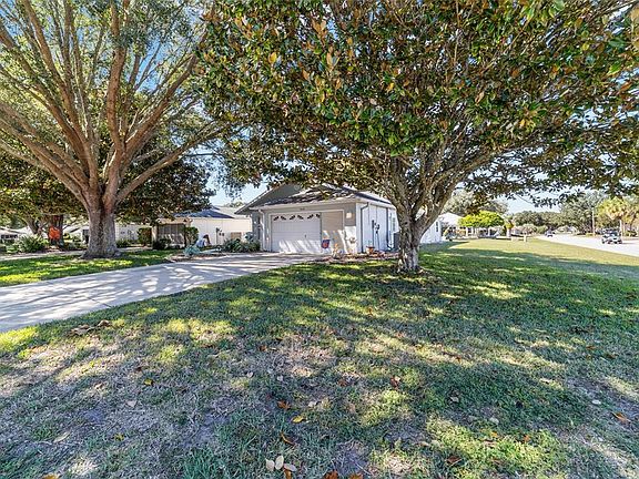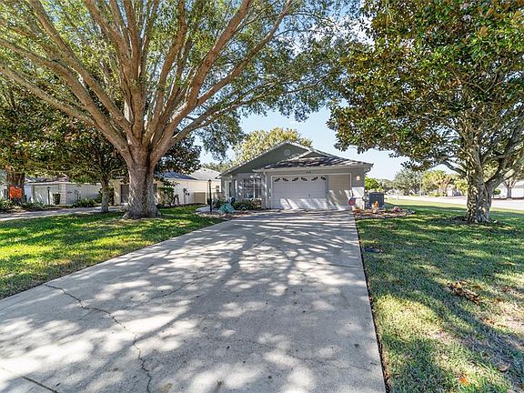 This immaculate Quincy model is located in the desirable Providence neighborhood of On Top of the World. This beautiful home features 2 bedrooms, 2 bathrooms, a 2-car garage, a versatile flex room (den), and an enclosed lanai with a built-in workstation, perfect for an office or craft room. The open-concept floor plan offers vaulted ceilings and a circular kitchen island that overlooks the great room, ideal for entertaining. The kitchen features newer stainless steel appliances, a pantry, and a stylish tile backsplash. The spacious primary suite includes a walk-in closet and an updated ensuite bathroom with designer dual vanity sinks, new cabinets, and a newer shower with subway tile and a frameless glass enclosure. The split-bedroom plan provides privacy for guests, with a large second bedroom and bathroom. Luxury vinyl plank flooring runs throughout the main living areas, with low-maintenance Berber carpet in the bedrooms. Situated on a large corner lot, this home offers a paver patio and deep green space between neighbors for added privacy. Major updates include a roof replaced in 2019, windows replaced in 2012, and front doors replaced in 2022. This home is clean, bright, and exceptionally well cared for. On Top of the World is Ocala's premier 55+ active adult, golf community with golf cart access to shopping, banking, restaurants, health and beauty.