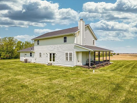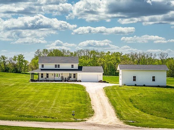 Experience the perfect blend of rustic charm and modern comfort in this stunning 4-bedroom farmhouse, nestled on 9.7 acres of scenic countryside. This prairie-style home welcomes you with a large wraparound porch, perfect for morning coffee or enjoying the expansive views of this one of a kind property. Inside, you'll find tasteful updates that flow beautifully from top to bottom. The heart of this home is the spacious eat-in kitchen that boasts modern appliances, stylish finishes, and plenty of counter space, and connects seamlessly to the living room, which is complete with a wood burning fireplace and beautiful accent wall. Just off the kitchen you'll find a large, recently updated laundry/mud room which leads to the attached 2+ car garage. There is a spacious formal dining room which offers an elegant space for hosting, with stunning views of the surrounding scenery. The main floor includes a versatile bedroom that could also serve as a home office, providing flexibility to suit your needs, and an updated half bath. Upstairs, the roomy master suite features a walk-in closet and a beautiful, newly updated attached bath with a whirlpool tub, separate shower, and dual sinks. In addition to the master, there are two additional bedrooms upstairs, as well as a cozy reading nook that adds an inviting space to unwind, and another updated full bath. Outside, the property features a versatile 24 x 40-foot pole building with updated overhead lighting, heating, and an 8x9 room with rough-ins - the ideal setup for a workshop or hobby enthusiast. This already impressive home also includes a new roof (2022), new furnace (2023) new A/C (2023), and is zoned FARM. Don't miss your chance to make this one of a kind retreat your own!
