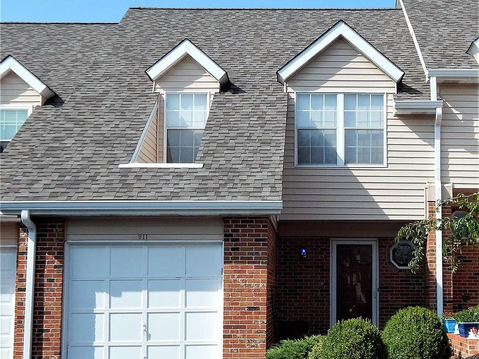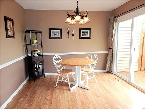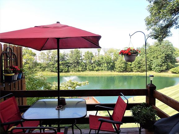 Brick 2BR townhouse w/gorgeous view of subdivision pond has attached garage & finished walk-out basement. Two-story family room w/wood-burning fireplace opens to dining room. Kitchen w/gas range/oven, built-in microwave, pantry, white cabinets, double sink & tile back splash. New carpet & paint. Wood veneer flooring throughout first floor. Separate dining room w/slider to private deck. Large carpeted rec room great for entertaining or additional sleeping area has half-bath. Lower storage & utility room. Basement slider to perennial-lined concrete patio opens to common ground w/ access to dock & fishing pond. Large master bedroom w/deep walk-in closet has office or sitting area. Updated full bath w/shower & tub combo has tile flooring. Entry foyer & balcony staircase. Reasonable condo fee ($270) includes pool, clubhouse, tennis, landscaping, exterior maintenance, water/trash/sewer, parking & pond. Central STL County location close to HWY 270 & Big Bend.