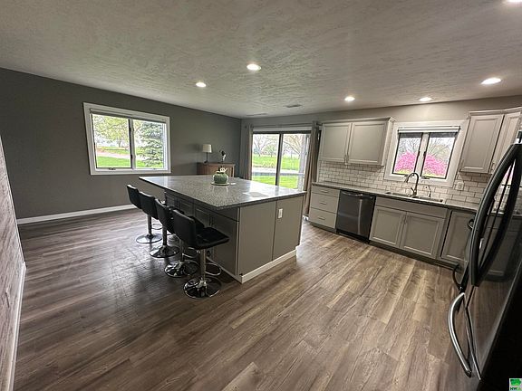 This 5-bedroom, 3 full bathroom, 2 half bath home in Elk Point offers impressive golf course views. The eat-in kitchen features a large 7-foot island, ideal for meal prep and gatherings. Relax in the master suite with a double showerhead shower in tiled surround, double vanity, and a private deck overlooking the 1st and 2nd holes of The Pointe Golf Course, Elk Point. Two additional bedrooms on each level provide flexibility for everyone. The in-basement laundry room adds to the home's functionality. Ample storage with a 2-car attached garage and a detached single-car garage with electric heater. Modern updates include new carpet throughout and LVT flooring. With that you will be located, 1/2 block from the Elk Point Swimming Pool which was built a few years ago. A Must See home with such a beautiful view, a home you do not want to miss.