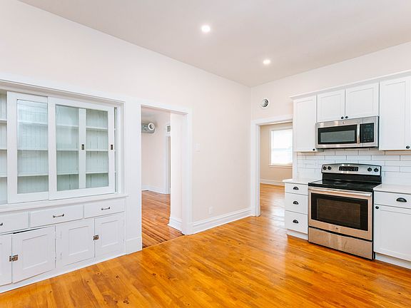 Inside, you'll find a fully outfitted kitchen, a separate dining area, a spacious living room, and a full bathroom. Many original details have been carefully preserved, such as vintage hardware and door knobs, classic fireplace mantels, and hardwood flooring, offering a blend of historic charm and modern convenience.
