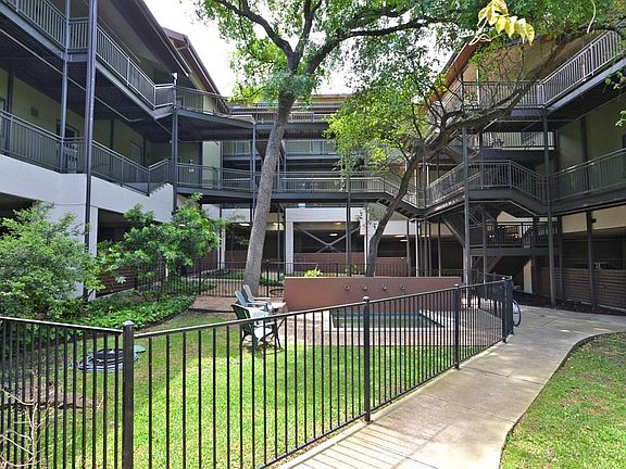 ALL FURNITURE FOR SALE. Beautiful, meticulously maintained condo and complex. Low maintenance and low HOA fees. Superior location to the university and medical establishment. Soaring ceilings, open floor-plan, numerous large windows and excellent light with views of the UT Tower! Excellent bedroom layout to maximize privacy. Gated and secure with easy, close, 2 car covered parking. Designer colors and touches throughout. Sub-metered water. New HVAC, water heater, and roof. This condo has it all!! A must see!