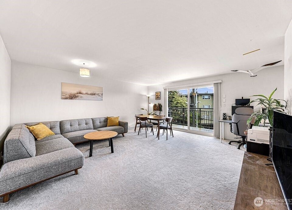 Welcome to Phinney Ridge! This quiet 1-bedroom, 1-bath top-floor end unit just steps from Green Lake offers privacy, natural light, and thoughtful updates throughout. Features include LED lighting, newer carpet, blinds, and closets, a stylish kitchen with stainless-steel appliances, a modern bath, dedicated off-street parking, private storage, and bike storage. The open layout extends to a spacious living room and large balcony with panoramic neighborhood views. Building remodels completed in 2018 with new decks, railings, windows, roof, and plumbing. With no rental cap, easy access to local restaurants, shops, PCC Market, and express transit to downtown, this unit is an excellent investment opportunity or perfect for your next home!