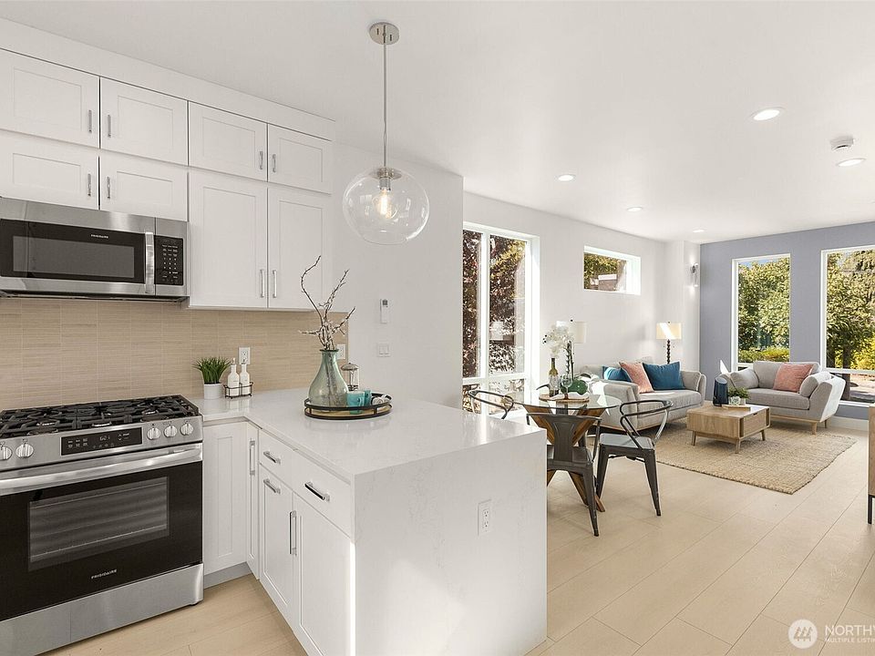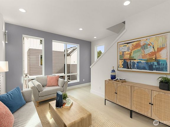 Welcome to your brand-new Greenwood home! This 3-bed, 2.5-bath modern residence stands out for its quiet middle-unit location, abundant natural light, and attractive floorplan. An open, sun-filled layout flows to a sleek kitchen with quartz counters and premium appliances. Primary suite with two additional bedrooms offers flexible space for home offices and guests. Enjoy year-round comfort with mini-split heating/cooling, dedicated off-street parking with EV charger, and enhanced security lighting for peace of mind. Minutes to parks, coffee shops, and transit, this never-lived-in home blends thoughtful design with a builder’s warranty and quick access to Seattle’s tech hubs.