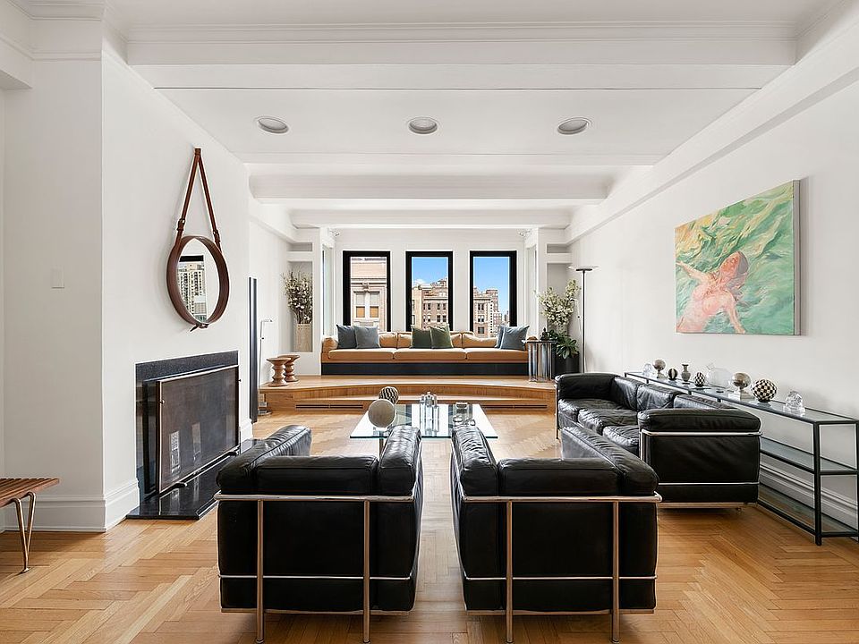 The expansive living room stretches nearly 30 feet, anchored by oversized north-facing windows that frame open city views and a wood-burning fireplace. Across the gallery, a spectacular 14-by-28-foot media room with south-eastern exposures offers an ideal setting for casual living and entertaining. It also functions beautifully as a library or optional forth bedroom.