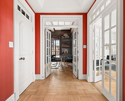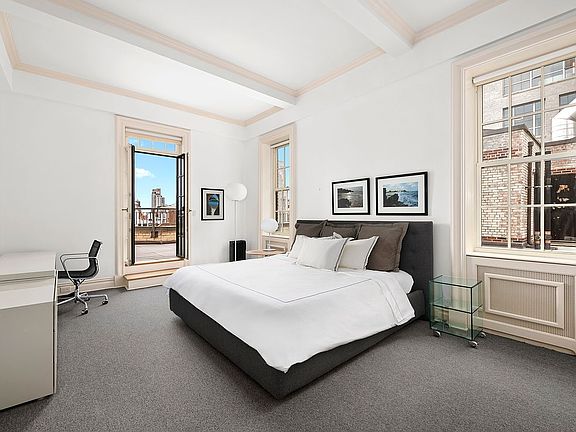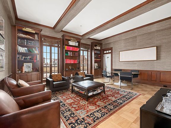 A private elevator landing opens to a gracious foyer leading to a magnificent corner living room with three exposures, a wood-burning fireplace, and two sets of French doors that open directly to the terrace. Soaring 11-foot ceilings and sun-drenched city views create a remarkable sense of light and scale.