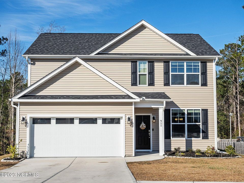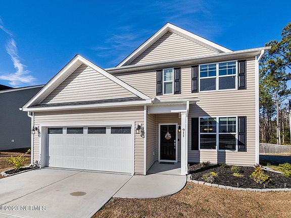 Wow!! This nearly brand-new home located in The Arbors was built in 2021 and is in immaculate condition! Sitting in a great spot conveniently located to shopping, coffee, and restaurants, you are also just a quick drive to the beach, military bases, Jacksonville and Wilmington! Boasting over 2000 square feet, all four bedrooms are spaciously located upstairs. The primary bedroom has plenty of space for a king size bed, as well as an ensuite bathroom featuring dual vanities and TWO closets (one a large walk-in!). Downstairs features low maintenance LVP flooring throughout, a formal dining room, and an upgraded kitchen that includes granite countertops, white subway tile backsplash, 42'' gray cabinets, and a pantry! Better yet, enjoy the wonderful Carolina weather out back off of your beautiful covered wooden deck! The Arbors is a top notch neighborhood with sidewalks, a community pool, a dock, and more! Schedule your showing today!