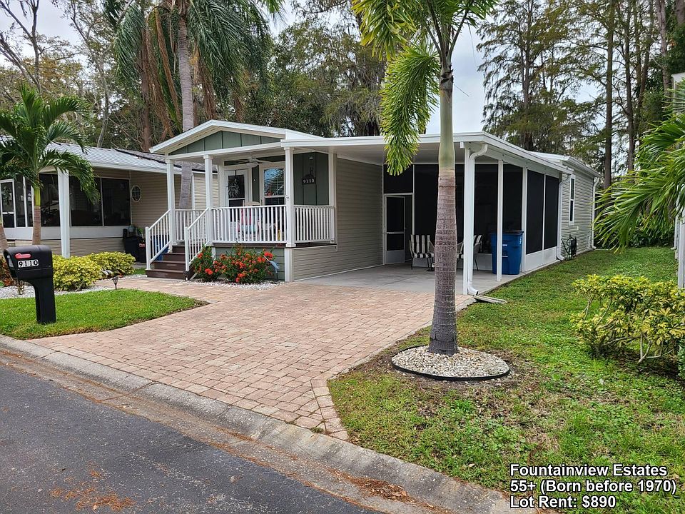 55+PARK/2018/2BED2BATH/1352SQFT/DECK/SCREENED-INPATIO *** Fountainview estates requires insurance on their homes, Which also requires a 4-point inspection to be completed, we are offering: -Free 4-point inspection -Free Insurance Consultation & Guidance with purchasing your policy.*** This modern and meticulously maintained 2-bedroom, 2-bathroom home offers 1,352 sqft of well-designed living space with thoughtful details throughout. From its inviting interior to its beautifully landscaped exterior, this home is perfect for comfortable living and entertaining. Interior Features: Step inside and be welcomed by an elegant and open design. The home showcases crown molding, recessed lighting, and crown-molding-trimmed windows, creating an upscale yet cozy space. The dark vinyl flooring seamlessly ties the living areas together. The spacious living room flows effortlessly into the kitchen, perfect for gatherings or quiet evenings at home. The kitchen features sparkling stainless steel appliances (all from 2018), white cabinetry offering abundant storage, and a unique built-in shelf above the fridge. The open layout makes meal prep a breeze while keeping you connected with family and friends. The master suite is thoughtfully designed with dual closets to maximize storage. The en suite bathroom offers a walk-in shower, sleek fixtures, and a mirror with built-in lighting. The second bedroom is equally inviting, with a large closet for storage and proximity to the second bathroom. This bathroom features a shower/tub combination. Both bedrooms are carpeted for added comfort, while the rest of the home has matching vinyl flooring. Tucked neatly out of sight, the laundry closet offers a practical and efficient space for daily chores, conveniently located without disrupting the home's aesthetics. Exterior Features: The home's exterior is just as impressive as the interior. A stunning landscaped yard welcomes you, featuring white rock flower beds and mature trees. The inviting front deck is the perfect spot for morning coffee, offering a warm and welcoming entryway. The paved driveway leads to a covered carport, ensuring ample parking and protection from the elements. Attached to the carport is a screened-in patio, ideal for enjoying Florida's beautiful weather without the bother of bugs. Whether you're hosting friends or enjoying a quiet evening, this space is perfect for all occasions. A backyard shed provides extra storage, keeping your tools and belongings neatly organized. Community Perks: Living in Fountainview Estates means more than just owning a home - it's about embracing a vibrant community with amenities that cater to every lifestyle: Garbage Pickup: Routine waste collection makes daily life more convenient. Two Pools and a Jacuzzi: Enjoy endless relaxation and fun in the sun. Clubhouse: Perfect for hosting gatherings or attending community events. Fitness Center: Stay active and healthy with state-of-the-art equipment. Tennis Courts: Challenge friends to a match or perfect your game. Pet-Friendly Policies: Bring your furry companions along - they're welcome here! Whether you're lounging by the pool, attending a neighborhood event, or relaxing on your private deck, Fountainview Estates offers the ideal blend of comfort, community, and convenience. Don't miss the chance to call this beautiful property your home! Schedule a tour today!