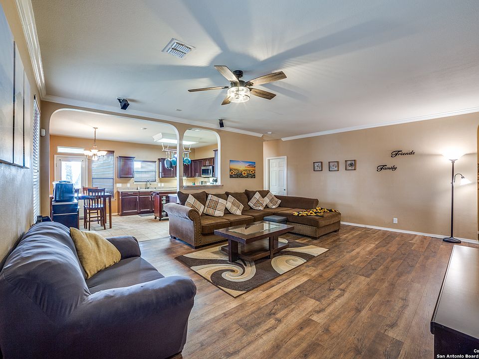 Nestled in the amazing Helotes, TX, this charming single-story home in the serene Arbor at Sonoma Ranch offers a perfect blend of comfort and convenience. Situated on a quiet street, this 3-bedroom, 2-bathroom residence boasts the coveted privacy of no rear neighbors and convenient greenbelt access via a private back fence gate. Step onto the welcoming front porch, ideal for relaxing and enjoying the peaceful surroundings. Inside, you'll be greeted by inviting wood laminate floors that flow through the entryway into the spacious living areas. To your right, two generously sized bedrooms share a well-appointed bathroom. The very large family room, pre-wired for surround sound, offers a fantastic space for entertainment. Natural light floods the open floor plan, seamlessly connecting the living room, dining area, and a kitchen featuring gas cooking and stylish undercabinet lighting. The primary bedroom provides a comfortable retreat for rest and peaceful sleeping, complete with a large bathroom featuring a separate shower and an amazing jetted tub perfect for ultimate relaxation. You'll also appreciate the roomy closet offering ample storage. Outside, discover a delightful Saltillo tile back porch with a ceiling fan, thoughtfully designed for outdoor cooking and relaxation. Recent upgrades include a new roof and a recent, larger Trane HVAC system with a combination smart thermostat, ensuring efficient and comfortable climate control. Living in Helotes offers a unique charm, known for its friendly atmosphere, top-rated schools, and beautiful Texas Hill Country scenery. Enjoy easy access to local amenities, parks, and major highways for convenient commuting. Whether you're looking to raise a family or enjoy a peaceful retirement, this location offers a wonderful quality of life with a strong sense of community and quick access to the vibrant city of San Antonio. Don't miss the opportunity to make this exceptional Helotes home yours!