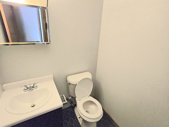 The first floor has a half bath, L shaped living room, dining room, and open floor plan to a sliding door and concrete patio. Wall to wall closet in the dining room. Galley kitchen with appliances.
