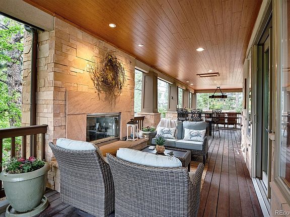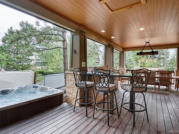 WISH LIST FULFILLED! Perched in The Summit at Heritage Hills on over a quarter-acre lot, this home is dressed to impress! With over $500,000 in update/remodel work over the past couple years, it is unique in every way and defines a rustic Colorado feel. Inside and out, there's no stone left unturned with attention to every detail. An entertainer's dream, it boasts an Ipe exotic wood wrap-around deck with a knotty pine ceiling. There are multiple seating and dining areas, a BBQ island with a Memphis pellet grill, a fireplace and a hot tub. The water feature is captivating with the lovely sound of six falls and a pond. Open the door to a large foyer, curved staircase with designer carpet and abundant newly refinished Brazilian Tigerwood floors. The living room is an inviting pub with wood beams, wainscoting and a fun vibe. The dining room has direct access through the leaded glass French doors to the deck. The kitchen boasts all new knotty cherry custom cabinets, leathered granite island, matte granite perimeter, 36" Bosch induction cooktop, KitchenAid French door refrigerator, dishwasher and double ovens. The drawer microwave is convenient and the pantry door is a stunning custom feature. The family room is spacious, has a 60" linear gas fireplace and reclaimed wood rare finds for shelves. Upstairs, the primary bedroom is fit for a king with its own fireplace and seating area but wait until you see the bathroom! Designed to be a spa, it includes handcrafted cabinets, vessel sinks, a two-person, curbless steam shower, a sauna and a gorgeous selection of tile and flooring. Three additional bedrooms, one with an en suite bathroom and two that share a bathroom, complete this level. The finished basement includes a fabulous flex space, currently used as an exercise room, family room, bar, huge guest bedroom, 3/4 bathroom and a woodworking shop. Two furnaces, two A/C units, Navien tankless water system and a water filtration system. Too much to list! Hurry! It won't last!